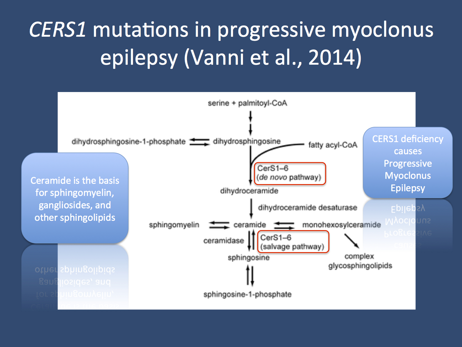 Animal model. Flincher and toppler are two mouse lines with mutations in the CERS1 gene. These animals also show a phenotype of neurodegeneration and seizures, a convincing parallel to the phenotype of the PME family described by Vanni and collaborators. Furthermore, an accumulation of lipofuscin can be seen in the brains of these two mouse lines. This feature is usually observed in the Neuronal Ceroid Lipofuscinoses (NCL), a group of mainly recessive neurodegenerative disorders that have progressive myoclonus epilepsies as a presenting feature. While the accumulation of lipofuscin was not seen in biopsies of patients with CERS1 mutations, this highlights a common pathophysiological pathway due to impairment in ceramide metabolism. The findings of the animal study also raise the question how an impaired synthesis may result in an accumulation of subsequent products. In fact, CERS1 is not only involved in de novo synthesis but also recycling of ceramide metabolites, which may be the explanation for this.