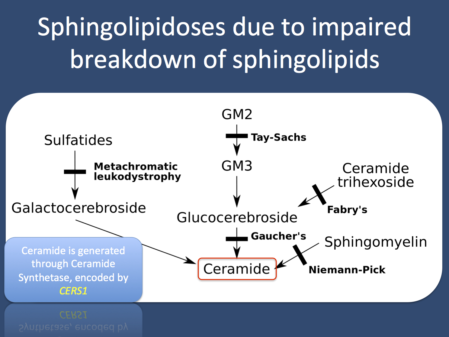 Lessons learned. The metabolism of ceramides, sphingomyelins, cerebrosides, and gangliosides is complex. However, these molecules appear to be important components of the neuronal plasma membrane, and defects in their metabolism result in various neurodegenerative disorders. Therefore, enzymes in these pathways are key candidates for yet unsolved cases of progressive myoclonus epilepsies.
