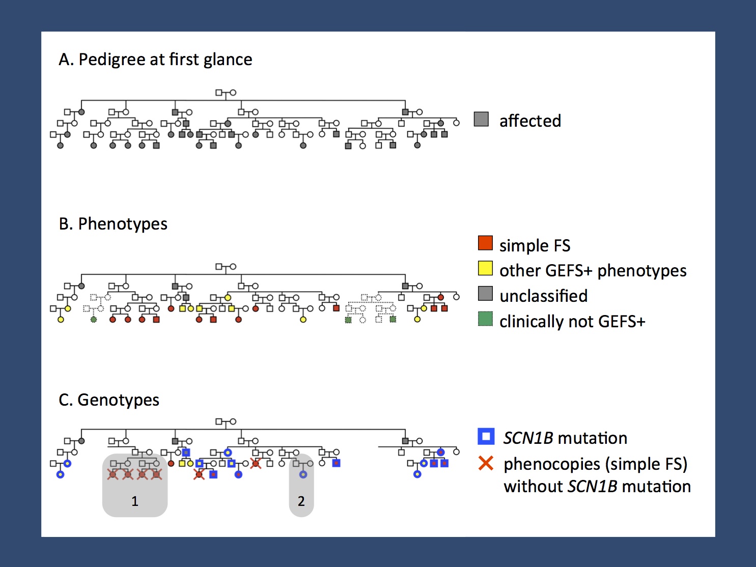 The intricacies of family studies in Febrile Seizures (adapted from Helbig et al., 2008 and Wallace et al., 1998). At first glance, this pedigree presents as an autosomal dominant pedigree (A). However, upon closer examination, the phenotypes differ. Some individuals have simple Febrile Seizures, while other individuals have Febrile Seizure Plus phenotypes or epilepsies not related to the spectrum of Genetic/Generalized Epilepsy with Febrile Seizures Plus (GEFS+, B). A mutation in the SCN1B gene could be identified in the individuals with FS+ phenotypes, but there is an entire branch in this family (1) with Febrile Seizures, who do not carry the SCN1B mutation and would be considered phenocopies (C). This example suggests that even in dense pedigrees with Febrile-seizure related phenotypes there is a high frequency of phenocopies. This phenomenon is a significant limitation to family studies in simple Febrile Seizures and suggests that other genetic studies might be more advantageous.