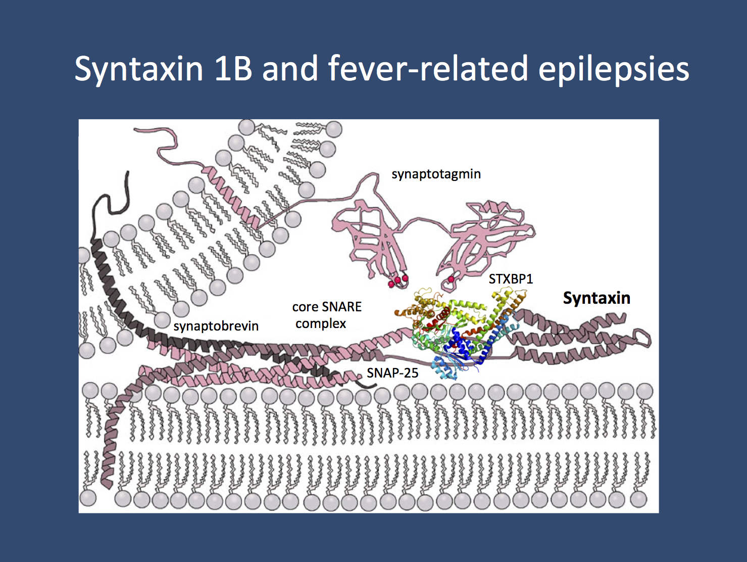 Syntaxin 1B. STX1B codes for syntaxin 1B, a presynaptic protein involved in the release of presynaptic vesicles. It is one of the proteins involved in the triple helix of the minimal fusion machinery, an ingenious mechanism of our neurons to merge synaptic vesicles with the plasma membrane. Basically, our neurons have one basic problem when it comes to neurotransmitter release: neurotransmitters are stored in vesicles, which need to be fused with the plasma membrane. In the same way that it is difficult to fuse soap bubbles – you’ll probably end up with multiple small bubbles rather than a single big one – neurons need to find a way to overcome the resisting force when two membranes are fused. The minimal fusion machinery works like a little tightening screw that pulls the vesicle close to the membrane until the vesicle is fused with the plasma membrane. Genes coding for proteins involved in the presynaptic release machinery are increasingly recognized in epilepsies including STXBP1, DNM1, and SNAP25.