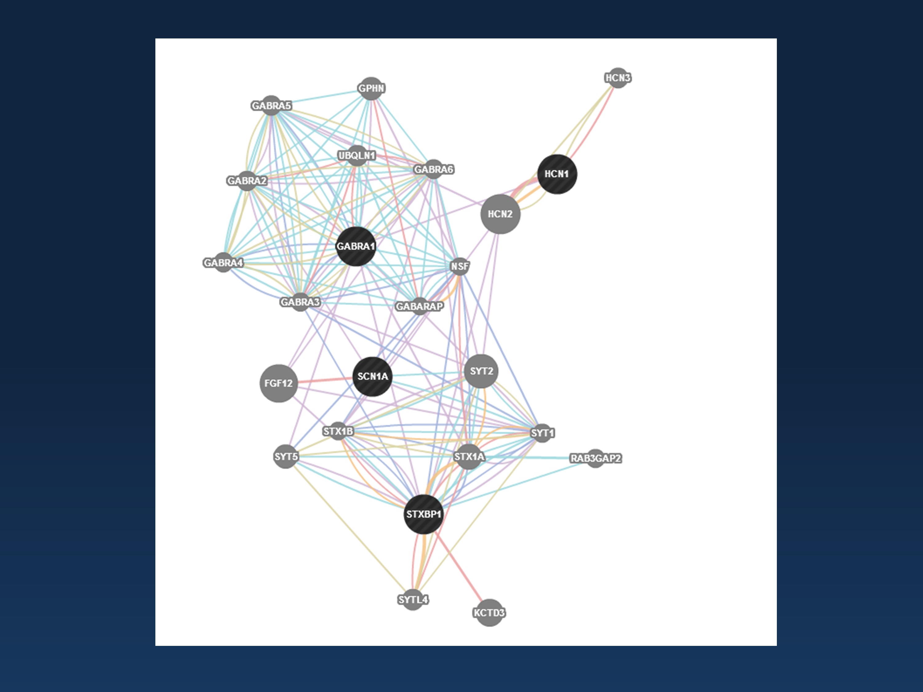 Screenshot of genemania looking at the connection between SCN1A, STXBP1, HCN1, and GABRA1. As recommended by the authors, I am citing the initial publication for this web-based tool as a reference: The GeneMANIA prediction server: biological network integration for gene prioritization and predicting gene function; Warde-Farley et al., Nucleic Acids Res. 2010 Jul;38(Web Server issue):W214-20. doi: 10.1093/nar/gkq537)