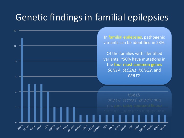 Afawi et al., 2016. The recent publication in Neurology review a comprehensive recruitment and phenotyping efforts in Israel and Palestine, covering 211 epilepsy families in total. In summary, 23% of these families could be explained genetically and 60% of these families have mutation in the “familial four”, SCN1A, SLC2A1, KCNQ2, and PRRT2.