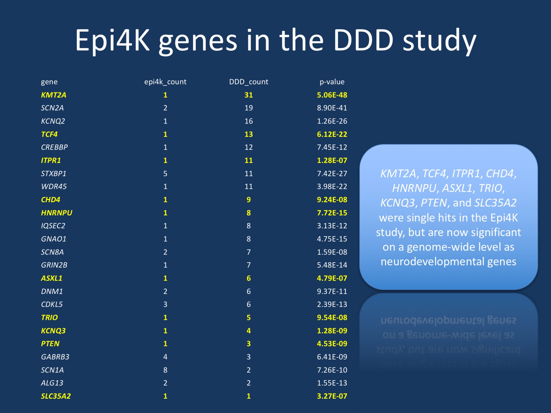 Figure 1. Confirming genes with de novo pathogenic variants from the Epi4K study in the DDD study. 10 genes that were previously single hits in the Epi4K study show a genome-wide significance in the DDD study. An additional 17 genes with single hits in Epi4K are found at least 3 times in the DDD cohort and are amongst the top 25 of the most intolerant genes in the human genome.