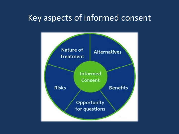 Informed consent. Obtaining informed consent is a process that must be tailored to each patient and their circumstances. A signature on an informed consent document is not sufficient in and of itself. Instead, it represents the final step of documenting the autonomous and voluntary decision made by a patient (or their proxy) after learning about and considering the potential positive and negative consequences. Situations that require particular sensitivity are those in which the patient is not an autonomous individual, such as a child or those who are cognitively impaired. In addition, the stakes are higher for those who are asymptomatic, but at risk to develop the condition or pass it on to their offspring.