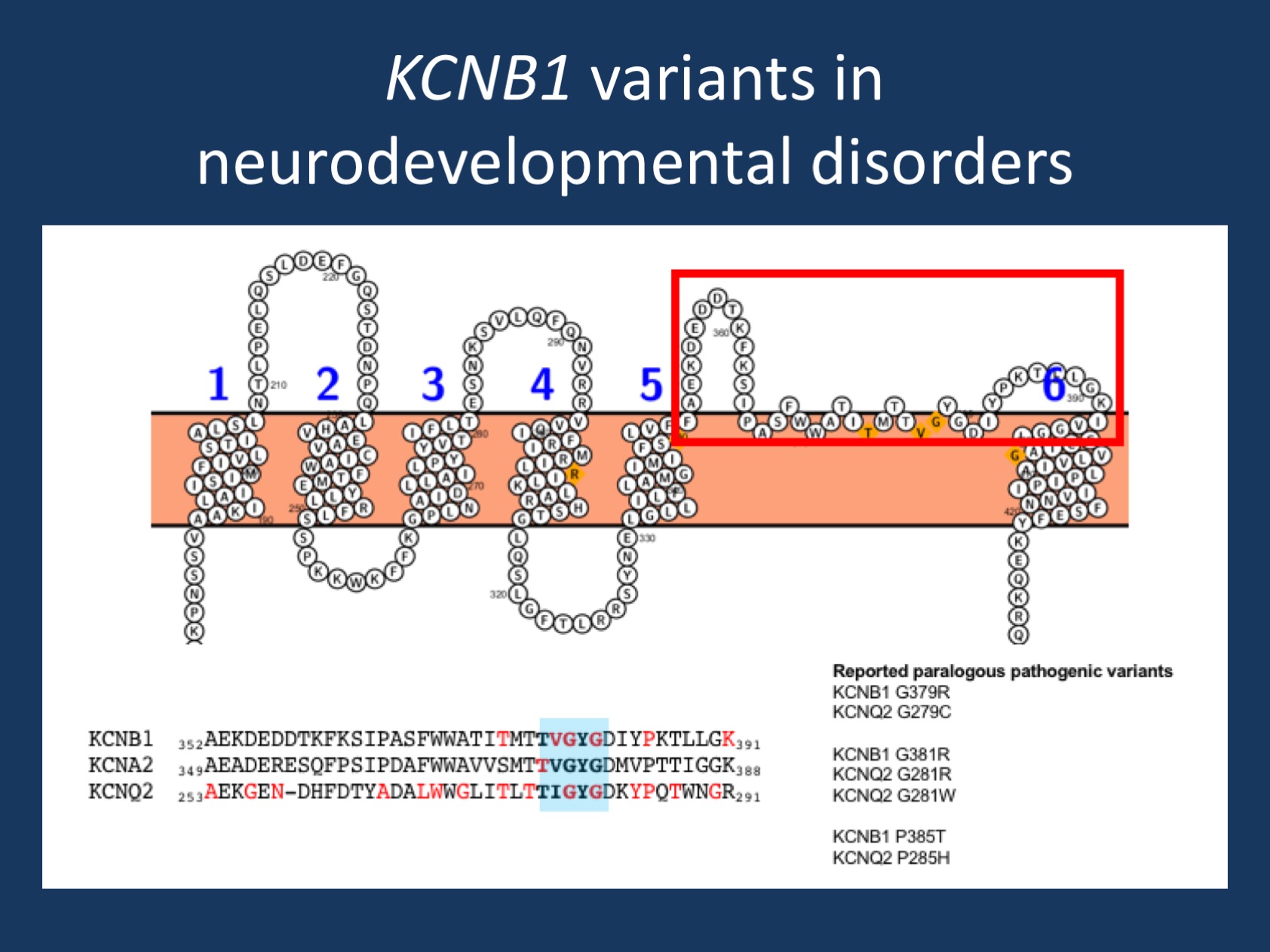 Parallels with other potassium channels. Some of the KCNB1 variants identified by de Kovel and colleagues have been reported in paralogous amino acid residues in other potassium channel encoding genes, indicating that these amino acids are important to potassium channel function. In particular, de novo variants affecting the ion selectivity filter between the S5 and S6 transmembrane segments have been reported in KCNB1, KCNQ2, and KCNA2. This highly conserved stretch of amino acids determines the ion selectivity of the channel, which means that it can discriminate between potassium cations and competing sodium and calcium cations. Altering any of these amino acids appears to be damaging to the channel and results in a disease phenotype, although interestingly not a uniform phenotype. As mentioned above, the V378A variant was reported by de Kovel and colleagues in a patient with a severe early-onset epilepsy whereas the V378L variant was described in a patient with non-syndromic intellectual disability.