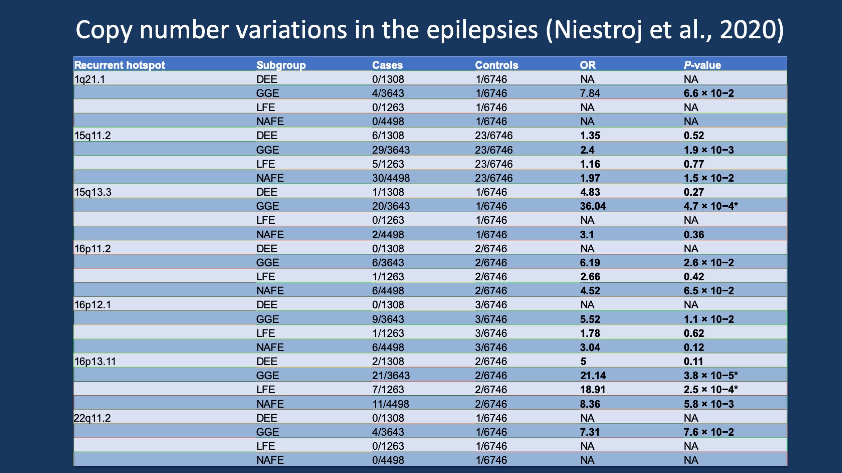 CNV study. In a recent publication in Brain, Niestroj and collaborators assessed the Epi25 study disease-causing CNVs, including 10,712 individuals with epilepsy of European descent and 6,746 ancestry-matched controls. This dataset is the largest dataset for CNV analysis in the epilepsies to date and represents the dataset that is analyzed in the most stringent way. All individuals were genotyped using SNP arrays and were strictly matched. The scope of the study alone makes this publication the definitive study on CNVs in the epilepsies. In line with our Epi25 criteria, the phenotypes included were the developmental and epileptic encephalopathies (DEE), Genetic Generalized Epilepsy (GGE), NAFE non-acquired focal epilepsy (NAFE), and lesional focal epilepsy (LFE).