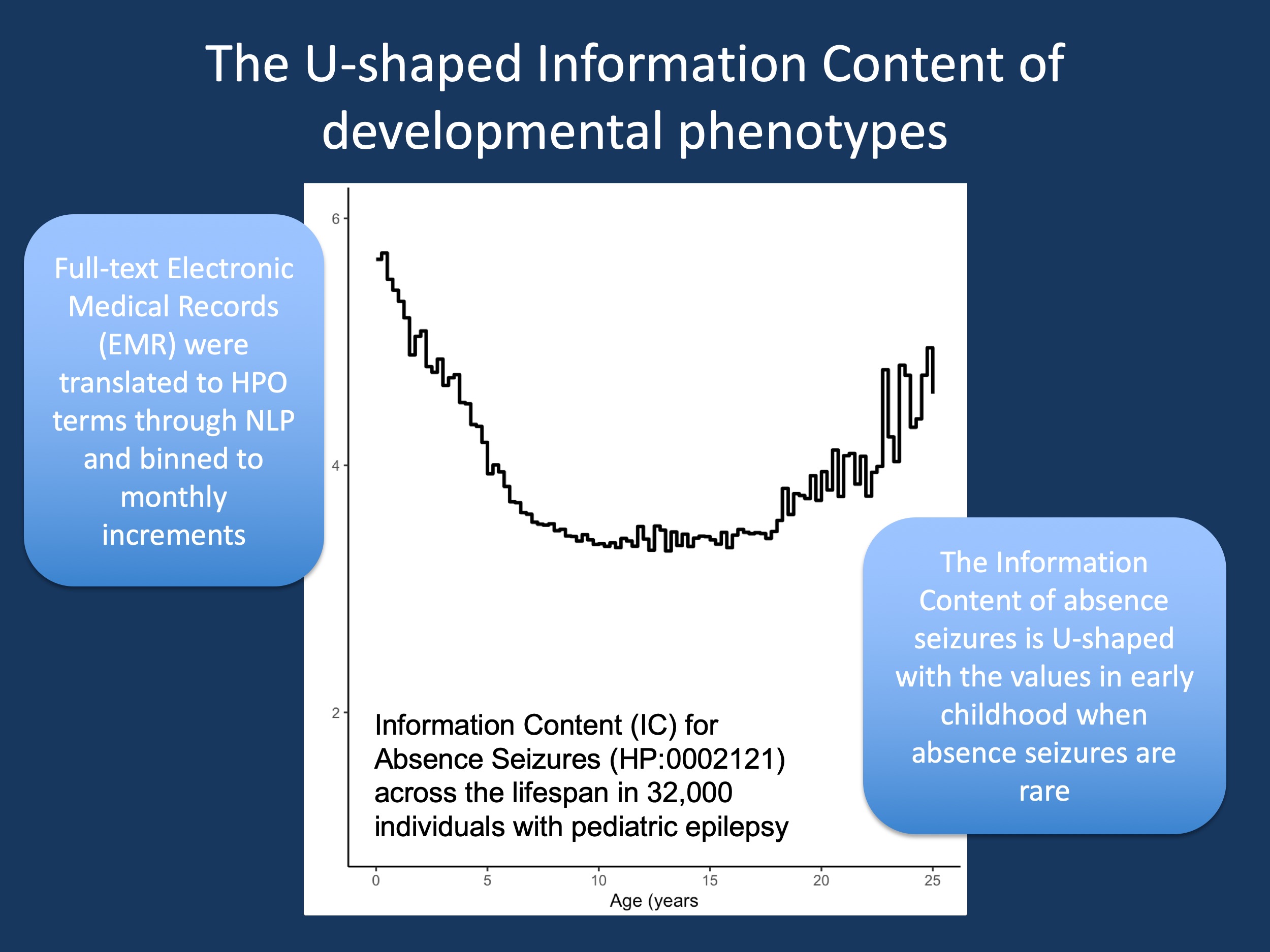 IC of absence seizures. Last week, I tasked Julie and Danielle from our group to examine just that, looking at the longitudinal Information Content of Absence Seizures. I gave them the seemingly military-style instructions: “you have 60 min. Oh, and by the way, it is going to be U-shaped.” However, before you might get a wrong sense of the general atmosphere in our lab, please let me explain. I said this with a smile on my face as this was meant to be a teaching point. We actually had all the data already, as we were currently working through one of the largest, harmonized datasets on pediatric epilepsy that had ever been generated: patient notes of 32,000 individuals mapped to standardized Human Phenotype Ontology (HPO terms) and binned to monthly time increments. Julie and Danielle literally only had to click a button.