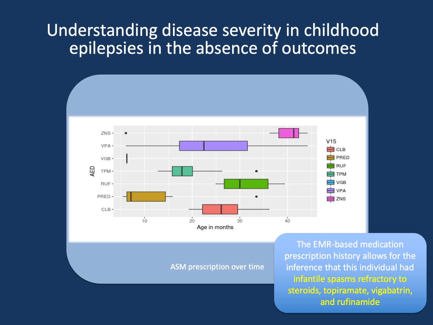 Conclusion. When I went through some of my old presentations over the weekend, I came across a figure that I had used five years ago for introducing the concept of EMR genomics (Figure 1). In brief, looking at this medication trajectory allows for the conclusion that we are looking at the disease history of an individual with refractory infantile spasms not responding to steroids, topiramate, vigabatrin, and rufinamide. Accordingly, we can build computational algorithms based on this pattern recognition and apply them at scale with datasets that have been genotyped in order to identify genetic factors driving particular drug responses. And even in the absence of available outcome measures, there is meaningful clinical information that can be used as a proxy.