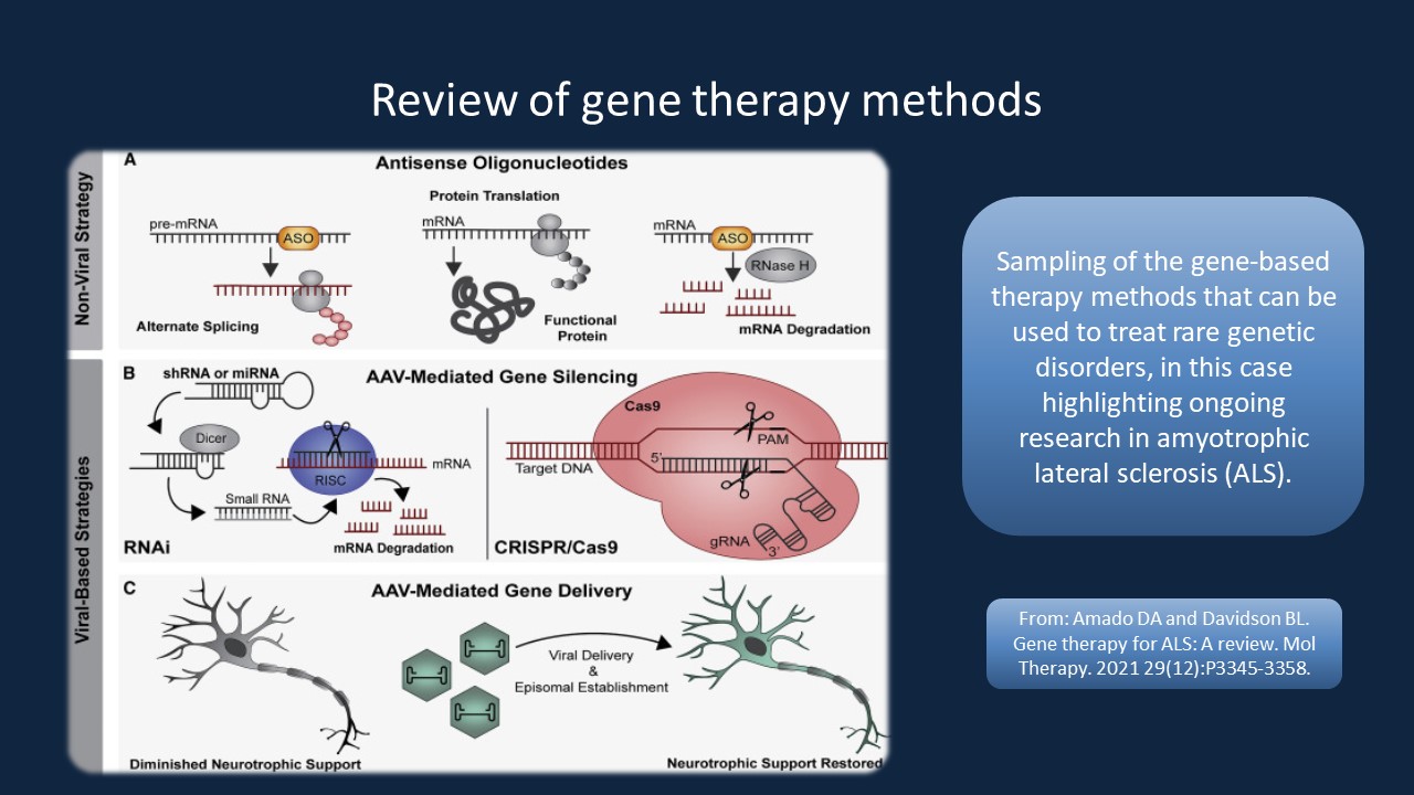 Figure 1. This figure from Amado and Davidson (2021) shows examples of the targeted therapies described in this post. This includes antisense oligonucleotides (A) and viral-based silencing of a gain of function allele (B) or supplementation of a loss of function allele (C). The figure is focused on therapies for amyotrophic lateral sclerosis, while this blog is focused on syndromes resulting from CNVs in 15q11-13; however, the overall principles are similar.