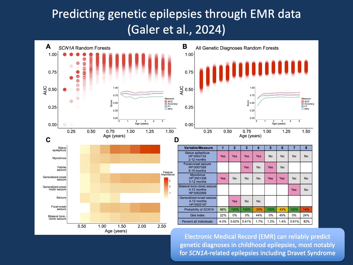 Combinations. The overall power to predict an SCN1A diagnosis was the highest amongst the various genetic epilepsies in our study. Various measures of predictive power such as Area Under the Curve (AUC), Accuracy, F1, and Positive Predictive Value (PPV) were well above 75% across the entire age range (Figure 1A). However, how we arrived at these predictions was interesting. There was no single way to predict SCN1A, but instead a combination of many rare predictions. We were able to demonstrate that the presence of status epilepticus and myoclonus in the first year of life is highly predictive of a causative SCN1A variant but only applies to 4% of all individuals who were later diagnosed. Other combinations of features have similar predictive power but are also individually rare. This emphasizes that there is not one single way to predict Dravet Syndrome, but a combination of various scenarios. In brief, to predict genetic epilepsies, we need to appreciate their clinical heterogeneity and that combinations of rare clinical features add up. This is where large data analysis comes in. Given that our study was based on EMR data, it can be implemented in the very systems that generated the data in the first place.