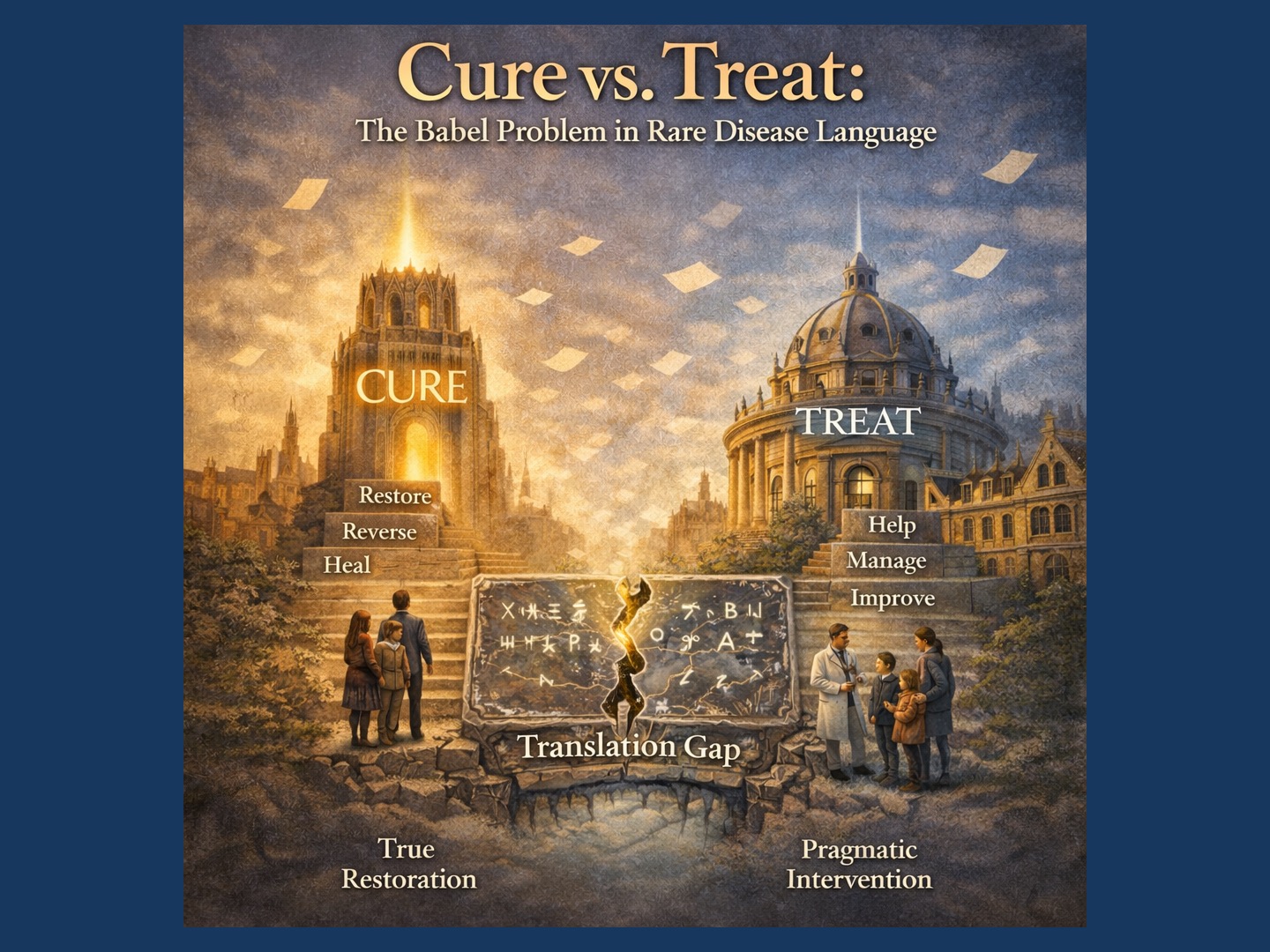 Figure 1. Conceptual illustration of cure versus treat as a Babel-like translation problem in rare disease. Echoing the visual language of RF Kuang’s Babel cover, twin Oxford-like towers face each other across a fractured silver-working tablet, the Translation Gap. Floating pages and cryptic glyphs evoke untranslatable meaning, where promise, hope, and trust accumulate. In rare disease, these gaps shape expectations, advocacy narratives, and the clinician–family contract.