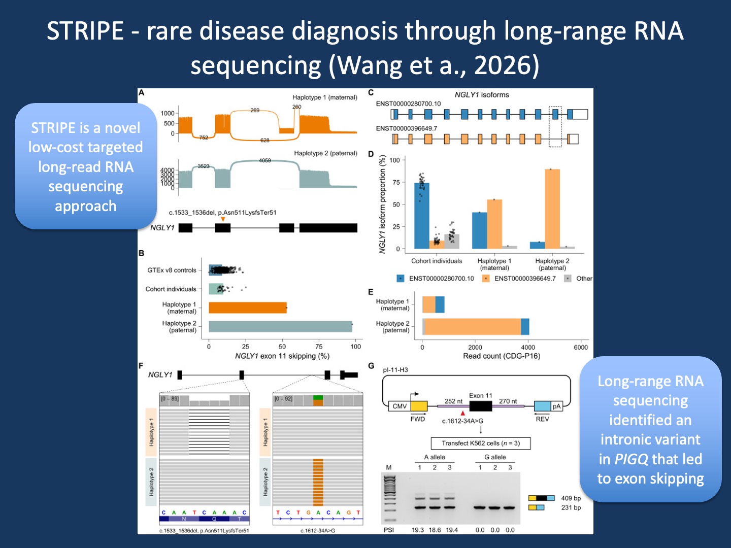 Examples. Some of the most instructive examples in our STRIPE paper come from genes that are already familiar to us in neurogenetics. For example, in a previously undiagnosed individual with early infantile epileptic encephalopathy, we identified PIGQ as the causative gene. STRIPE showed how a splice-altering variant in PIGQ generated abnormal transcript architectures that would have been difficult to reconstruct from short reads alone. In another individual, we identified a paternally inherited intronic variant in NGLY1 that led to skipping of an entire exon, a variant that would likely not have been recognized as causative without directly observing the altered splicing patterns.