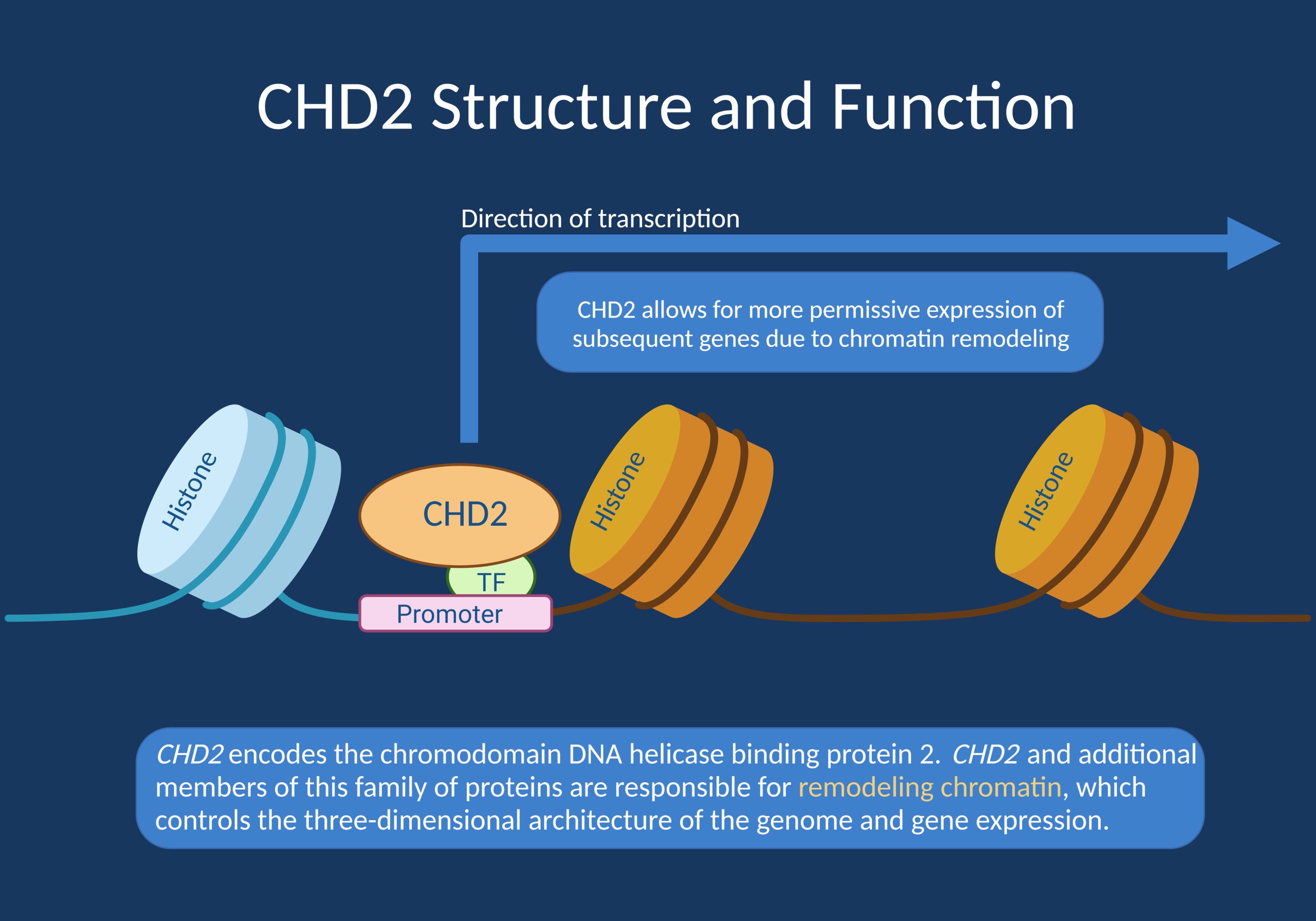 Figure. Cartoon depicting the function of CHD2. In brief, CHD2 stands for chromodomain DNA helicase binding protein 2, which is involved in chromatin remodeling. DNA is typically tightly packed around histones and therefore inaccessible to transcription. CHD2 is one of the many proteins involved in making DNA accessible for transcription and gene expression [created with BioRender].