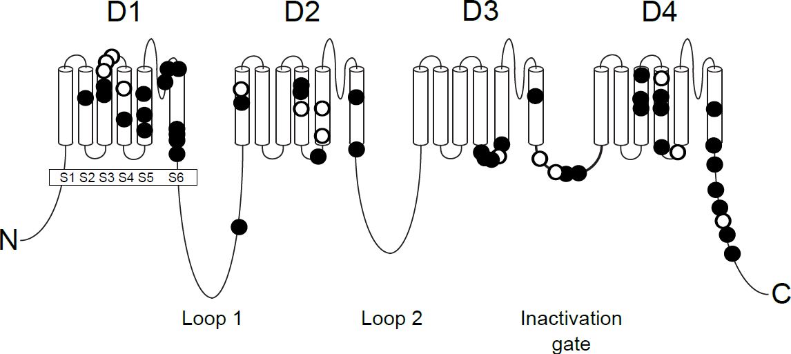 Nav1.6. SCN8A encodes the voltage-gated sodium channel alpha subunit Nav1.6. The Nav1.6 protein comprises 4 homologous domains that each have 6 transmembrane segments, two large intracellular loops, the inactivation gate located between D3 and D4, and intracellular N- and C-terminal domains (See Figure). The pathogenic mutations are predominantly located in the transmembrane domains, the inactivation gate, and the C-terminus. These regions of the channel are much more highly conserved through evolution compared to the less well-conserved large intracellular loops and are more likely to be involved in channel function.