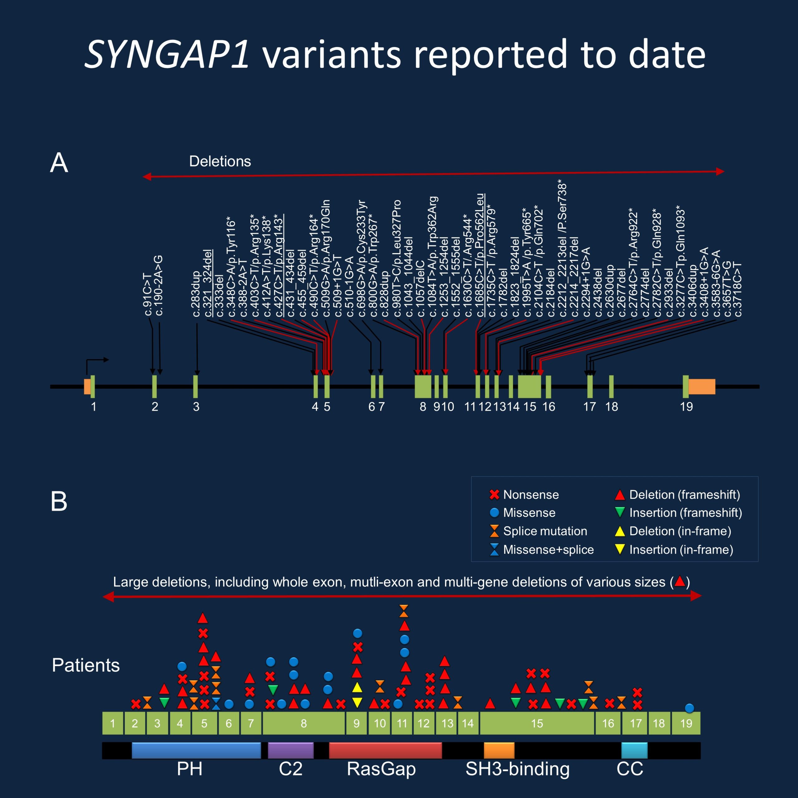 Figure 1. Spectrum of disease-causing variants in SYNGAP1. (A) Selection of variants reported in the literature since 2015, updated since our prior blog post. (B) Types of variants reported in the SYNGAP1 gene, demonstrating the wide range of genetic changes identified through diagnostic testing.